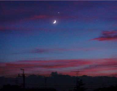 9月7日、台風14号が去り、夕焼けの中の三日月と金星です。